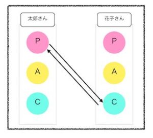 太郎さんがPの自我状態で花子さんのCに働きかけており、花子さんがAの状態で太郎さんのCの状態に関わっている時です。このやりとりはお互いの対立を生む土壌となるものです。